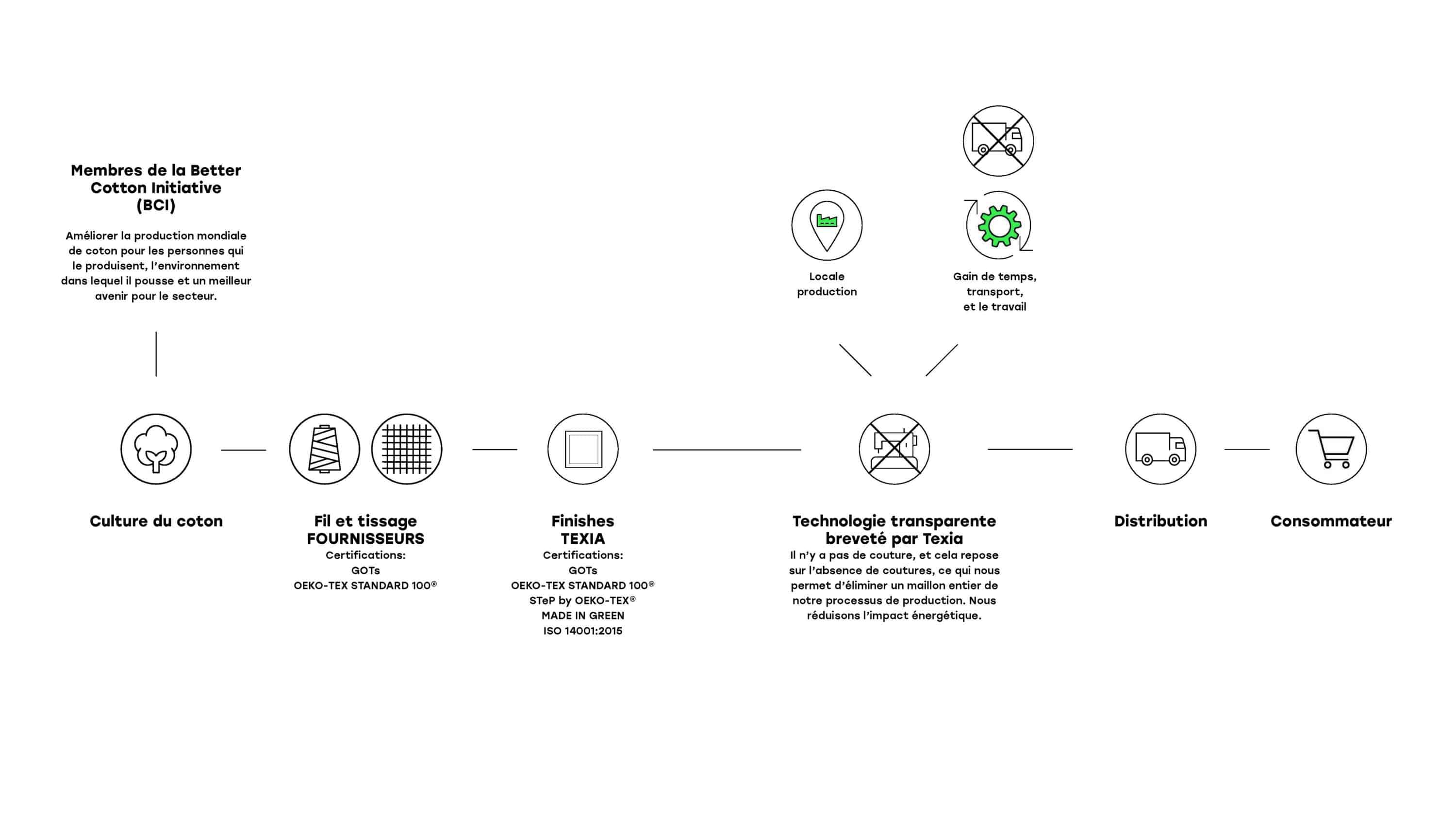Chez Texia, nous misons sur l’utilisation de matières premières de qualité, responsables sur le plan social et environnemental. Tous nos produits sont fabriqués avec des fibres naturelles, principalement du coton.
